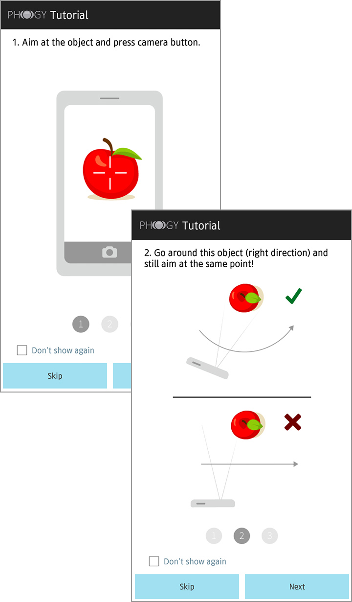 [Take Phogy]をタップした後、右側の画像のようなチュートリアルが表示されます。表記は英語ですが、イラスト入りで撮影のコツを教えてくれます。3STEPのチュートリアルを読み終わったら、[Start]をタップすると撮影画面が表示されます。[Don't show again]をタップすれば、次回からチュートリアルは表示されません。