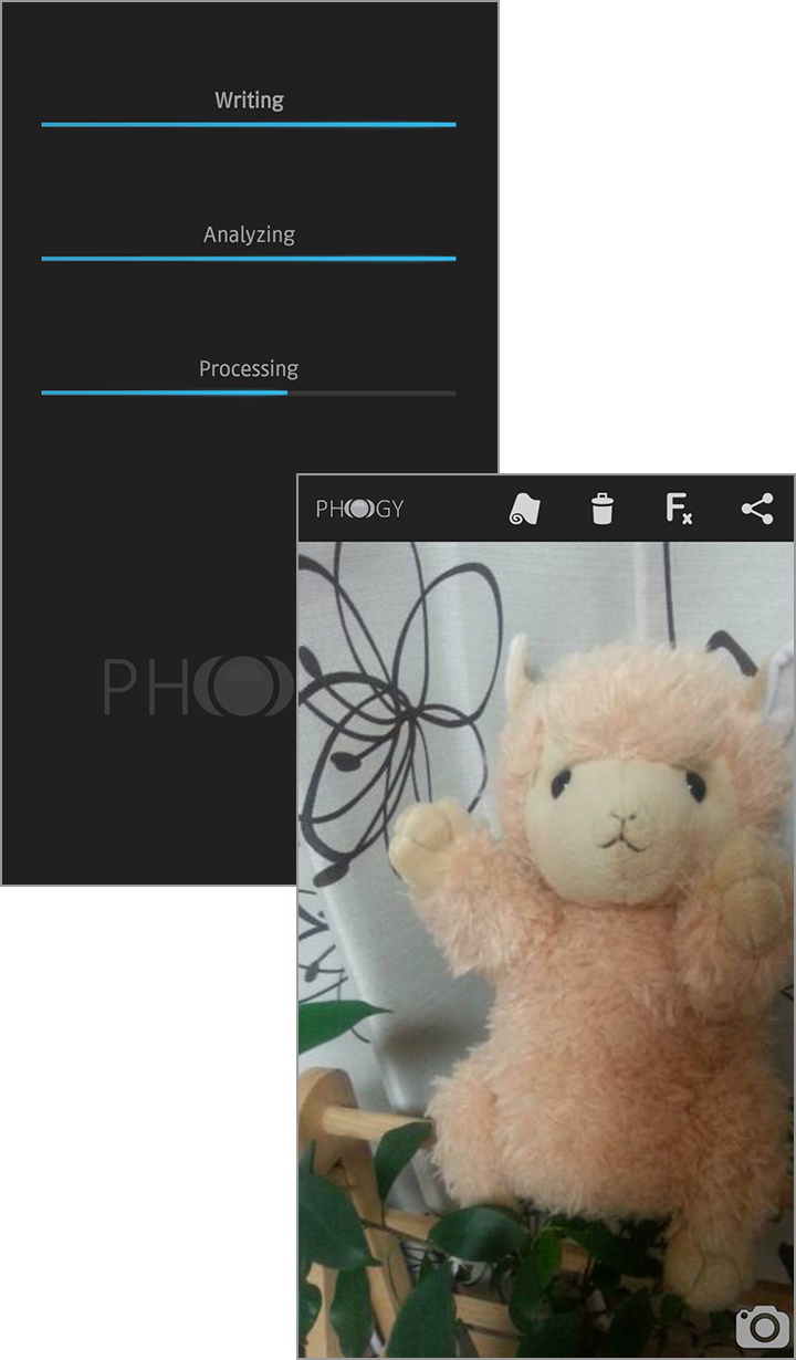 カメラボタンをタップした後は、一定時間で撮影が終わってしまうので、最初は慌ただしく感じますが、慣れてしまえば簡単です。カメラボタンをタップする→弧を描くように右側に動かす、という単純な操作です。撮影時時間は、[Setting]で[2secnds(2秒)]と[3secnds(3秒)]を選ぶことができます(3秒以上の時間を設定するには、Pro版へのアップグレードが必要です)。撮影後は、写真に変換されるのを待ちます。