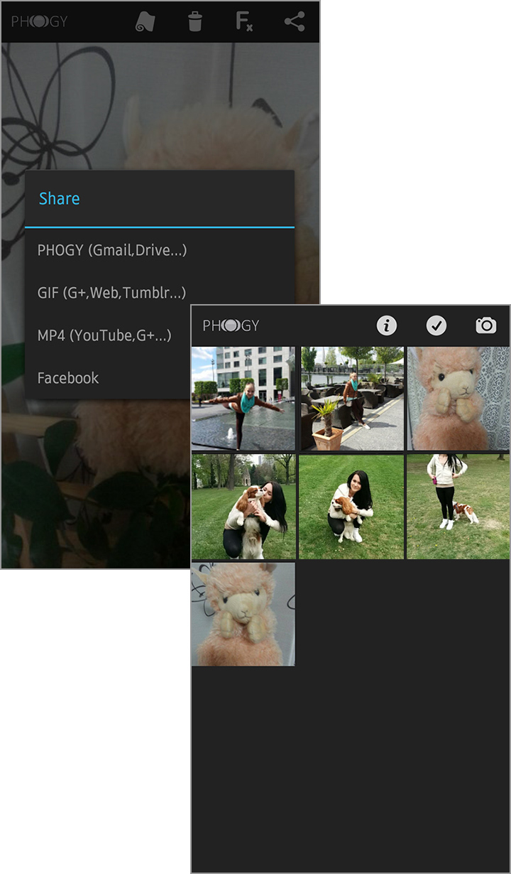 メニュー画面の[Gallery]をタップすると、これまでに撮影した写真を一覧で確認することができます。サムネイルをタップすると、画面に大きく写真が表示されます。写真が表示された状態で、スマートフォンを左右に傾けてみてください。動かす角度に合わせて、写真が動きます。