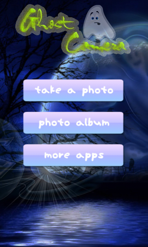 「ゴーストカメラ」は、かんたんな操作で写真に幽霊画像を合成できる、心霊写真アプリ。ちょっと怖いですが、試してみましょう。アプリを起動したら、[take a photo][photo album]のどちらかを選択します。カメラを起動して、幽霊画像入りの写真を撮影したいときは[take a photo]、端末に保存されている写真に幽霊画像を合成したいときは[photo album]を選びましょう。今回は[photo album]で試してみました。選択した写真が合成画面に表示され、ランダムに選ばれた幽霊画像が左上に表示されました。