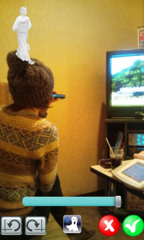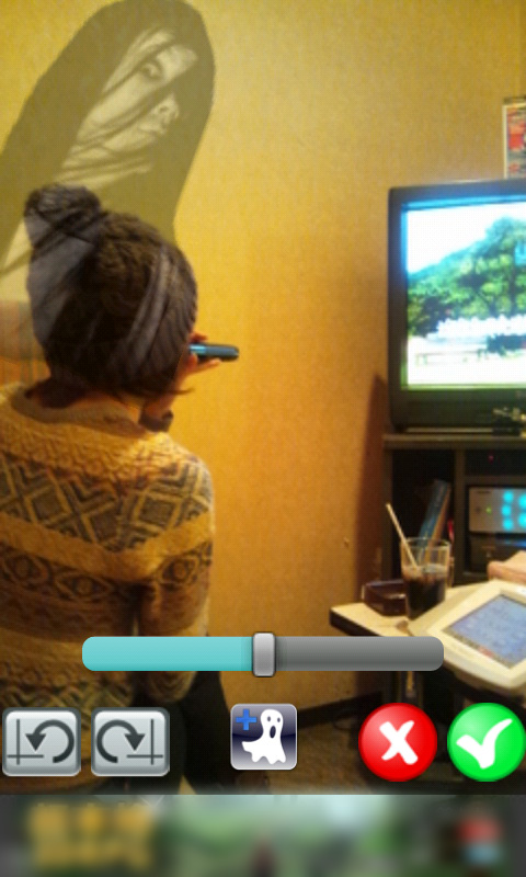 画面下部中央のゴーストアイコンをタップすると[Select ghost!]という画面が表示され、幽霊画像を選択することができます。恐ろしい幽霊、妖精、人形、赤ちゃん、中世風の人物など、いろいろなパターンの幽霊画像が揃っています。ホラー映画に出てきそうな、いかにもな幽霊を選んでみました。[Select ghost!]で幽霊を選んでタップすると、合成画面に表示されます。ドラッグで位置の変更、ピンチイン・ピンチアウトでサイズの変更、回転矢印のアイコンで左右の角度、スライダーで幽霊画像の透明度をそれぞれ調整できます。サイズや透明度を上手く調整して、心霊写真っぽさを出しましょう!