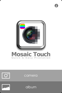 モザイクタッチ(MosaicTouch)」は、FacebookやTwitter、ブログなどに写真を投稿する際、顔や住所など公開したくない情報にモザイクをかけられる便利なアプリです。さっそく使ってみましょう。アプリを起動すると、[camera][album]が表示されます。その場で撮影した写真を加工したい場合は[camera]、端末に保存されている写真を加工する場合は[album]を選択してください。写真を選ぶと、加工画面が表示されます。画面下部の[color]メニューでモザイクの色、[size]メニューでモザイクの大きさを決めましょう。