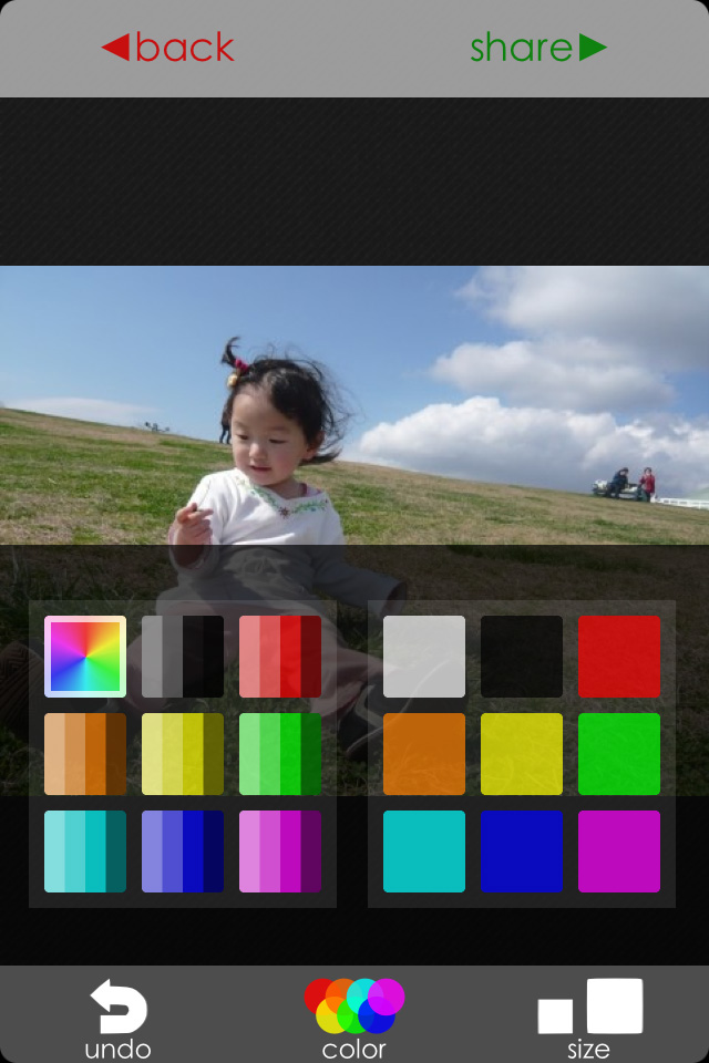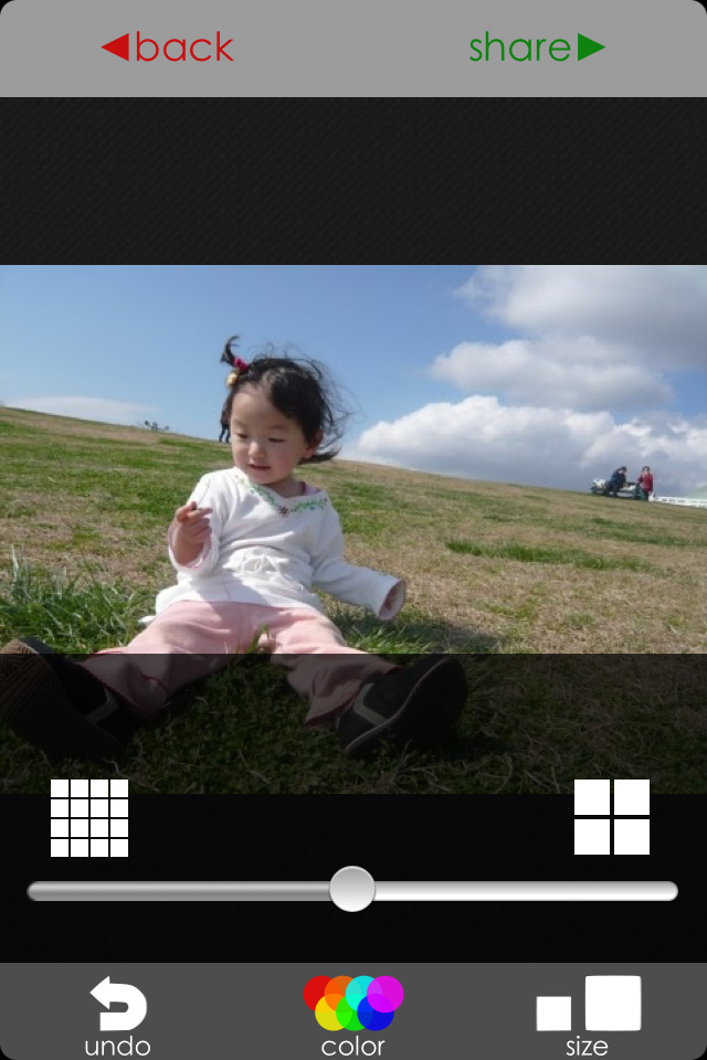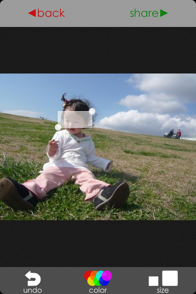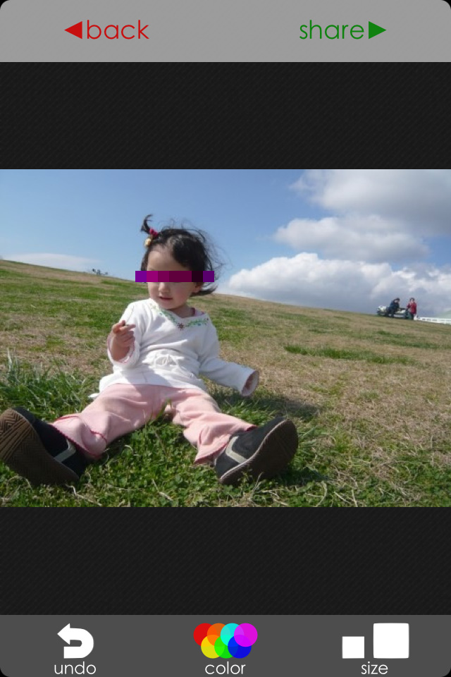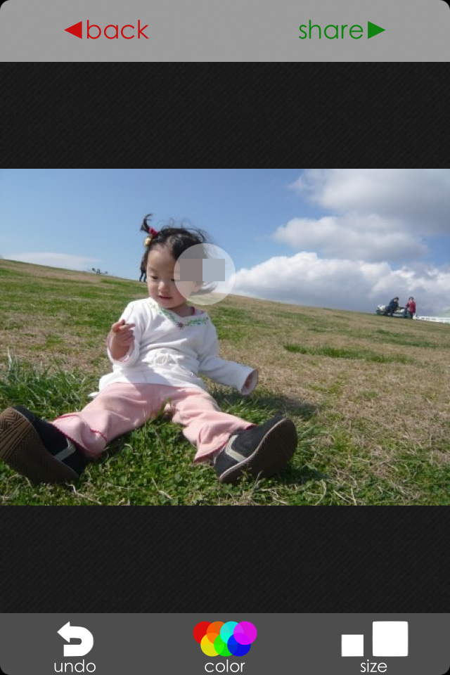 モザイクのcolor・sizeを決めたら、画面を指でなぞりましょう。1本指でタッチしながらなぞると、なおった箇所にモザイクがかかります。広範囲にモザイクをかけたいときは、2本指でピンチイン・ピンチアウトすることで、モザイクの範囲を指定することができます。失敗してしまったら、画面下部の[undo]をタップ。一つ前の画面に戻すことができます。