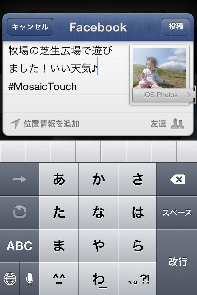 Colorを変えると、カラフルなモザイクをかけることもできました。ポップな雰囲気になりますね!納得の仕上がりになったら、画面上部の[share]をタップして写真を共有しましょう。[Instagramで共有][Twitterで共有][Facebookで共有][カメラロールに保存][その他]のメニューから、共有したいものを選んでくださいね。コメントと写真を一緒に投稿できる画面が表示され、らくらく共有できますよ。