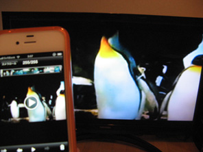 準備が整ったら、いざ出力。スマートフォンで撮ったペンギンの動画を、テレビに出力してみました。さすがの大迫力!これなら、家族や友人が集まったときにも、自分で撮った動画やYouTubeで流行っている動画を楽しんでもらえますね。ちょっとしたホームパーティのイベントに、みんなで撮った動画を見せ合いっこするなんてのはいかが?