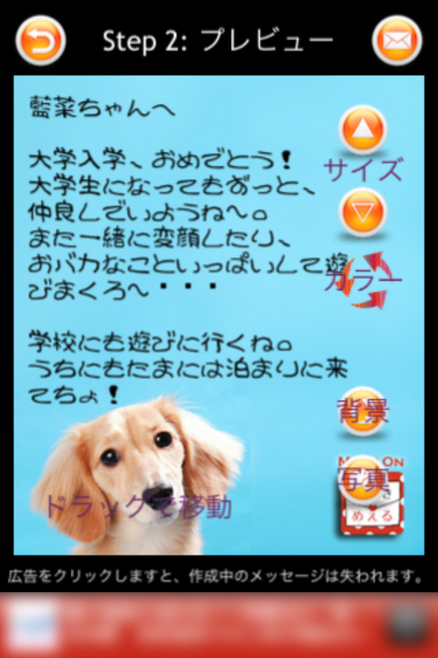 「てがきめえるFree」は、一見フツーのメールを手書き風にデコ・アレンジして、グリーティングできちゃうアプリ。メールの文字を手書きフォントにするだけで、かなりハートウォーミングな感じになりますよね! 本文を入力したら背景をチョイス。「背景」をタップすると6種類のかわいいテンプレートが表示されます。「写真」をタップすれば、撮りたてホヤホヤの写真やカメラロールの写真を背景にすることもできちゃいますよ!(画像右は、ケーキの写真を背景にしてみました)。本文の配置はドラッグするだけで移動できます。完成したものはメールで相手に直接送れるし、Twitterに投稿できちゃいますよ。