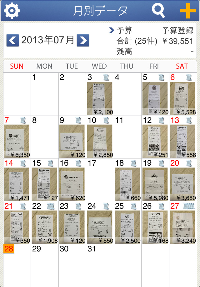 レシートを撮影して金額を入力することで、日や月ごとに確認できるアプリ。