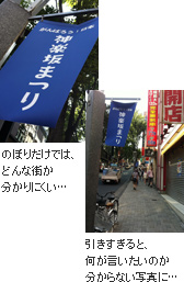 左の、「神楽坂まつり」と書かれたのぼりだけが写っている写真だと、場所の地名は分かりますが、いったいどんな雰囲気なのかよく分かりませんよね。
