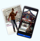 被写体は仏閣の近くに立ち、カメラマンは仏閣がすべて映るよう遠くに引いて「はい、チーズ」。