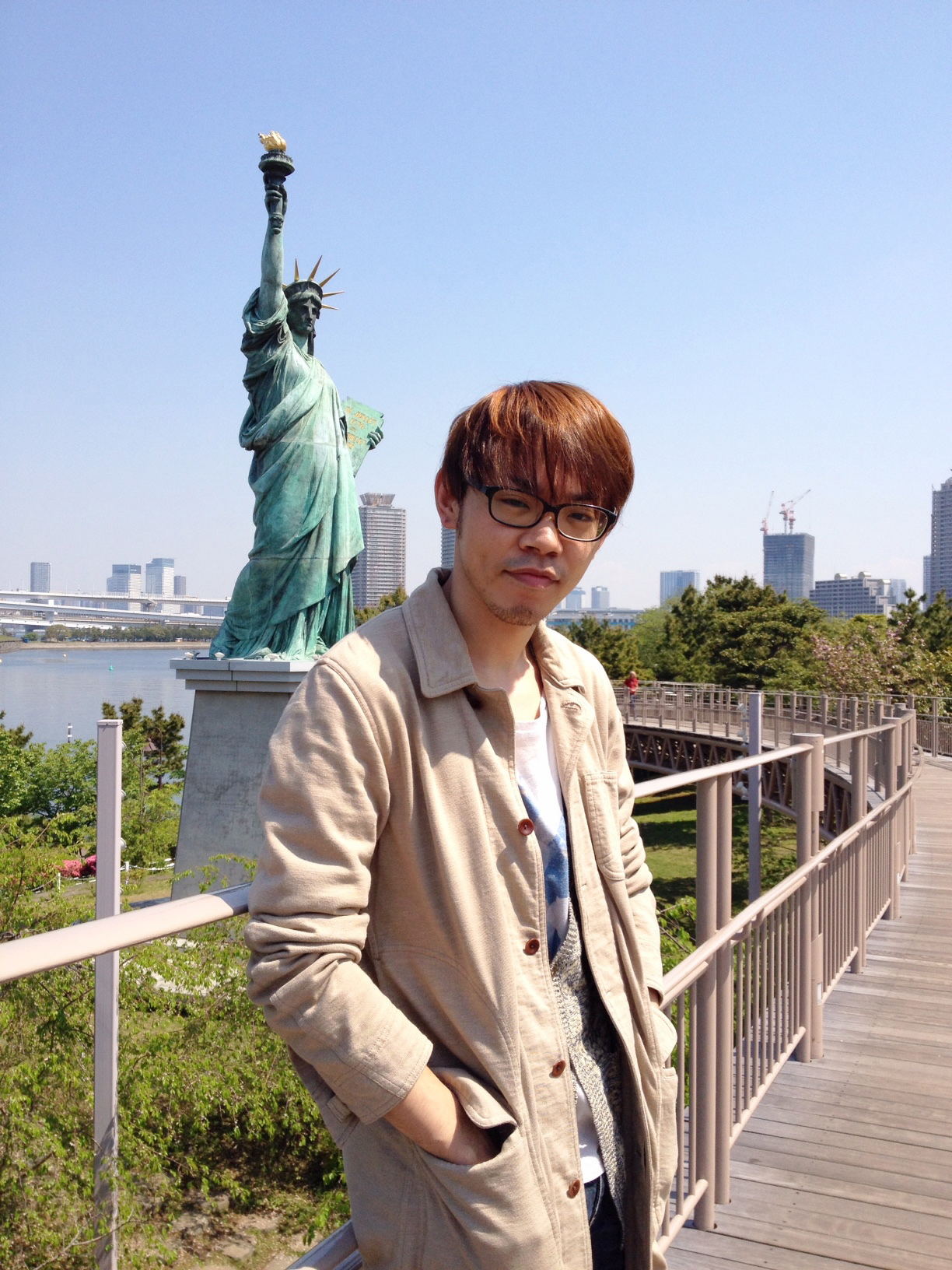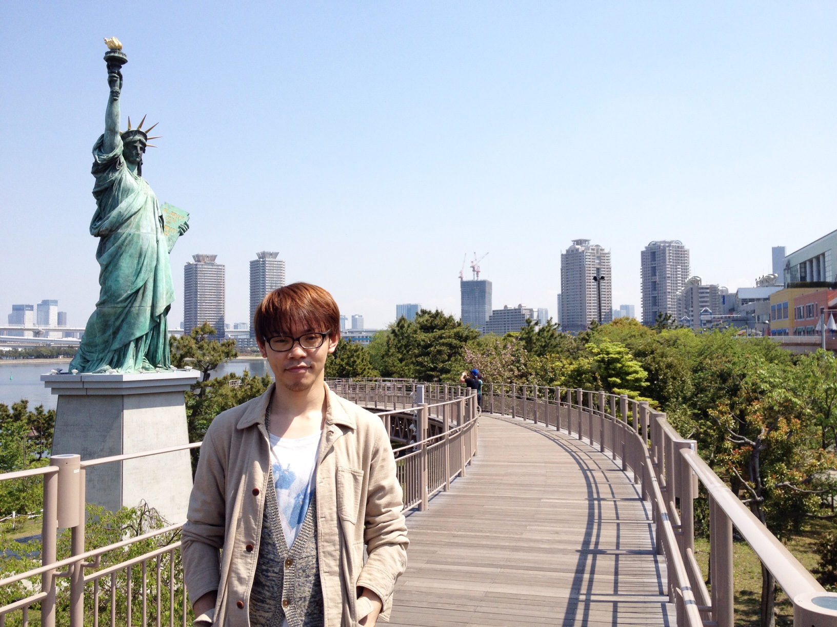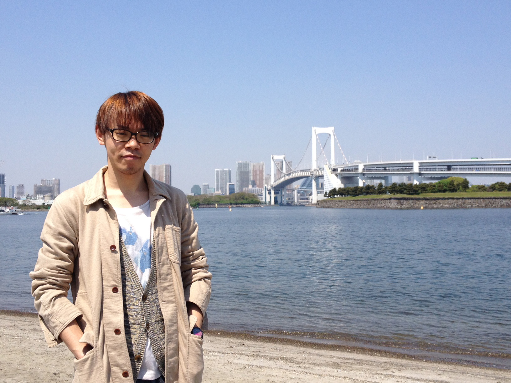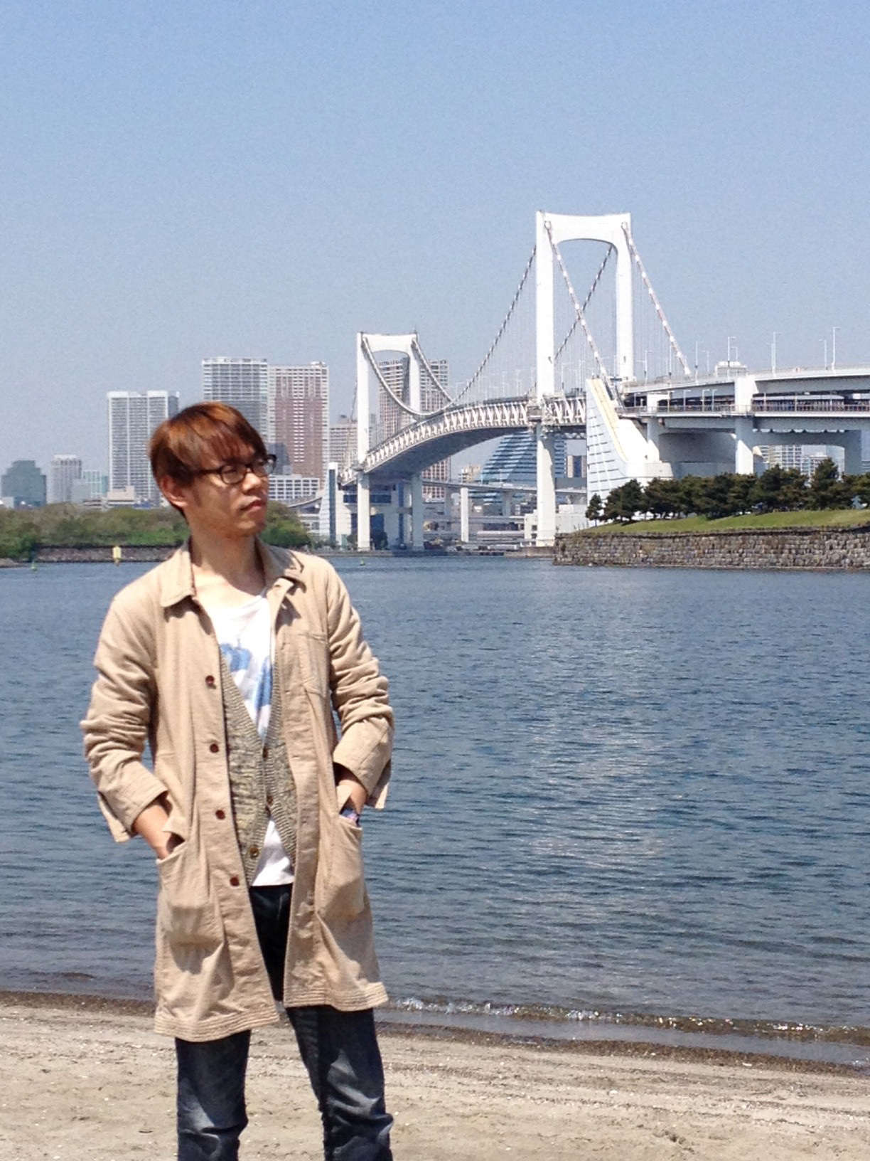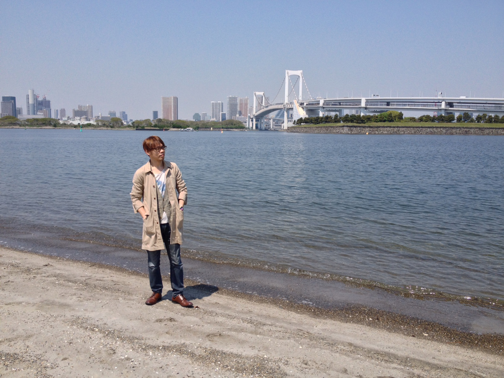 写真1。レインボーブリッジをバックに撮ったはずが、人物も名所も遠く、何を撮りたかったのかがわかりづらい