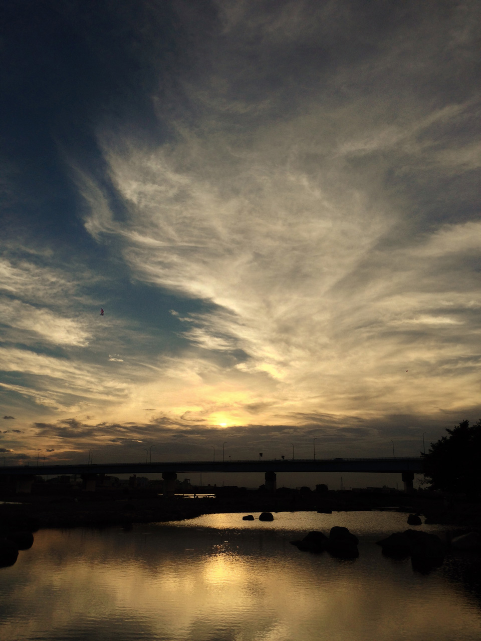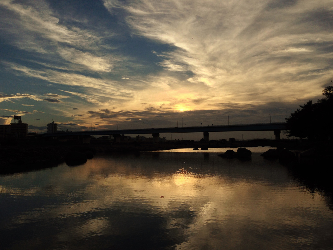 また、今回の写真のように川や海で撮ると夕焼けが水面に写り込むので、さらに広がりが出てきますよ。