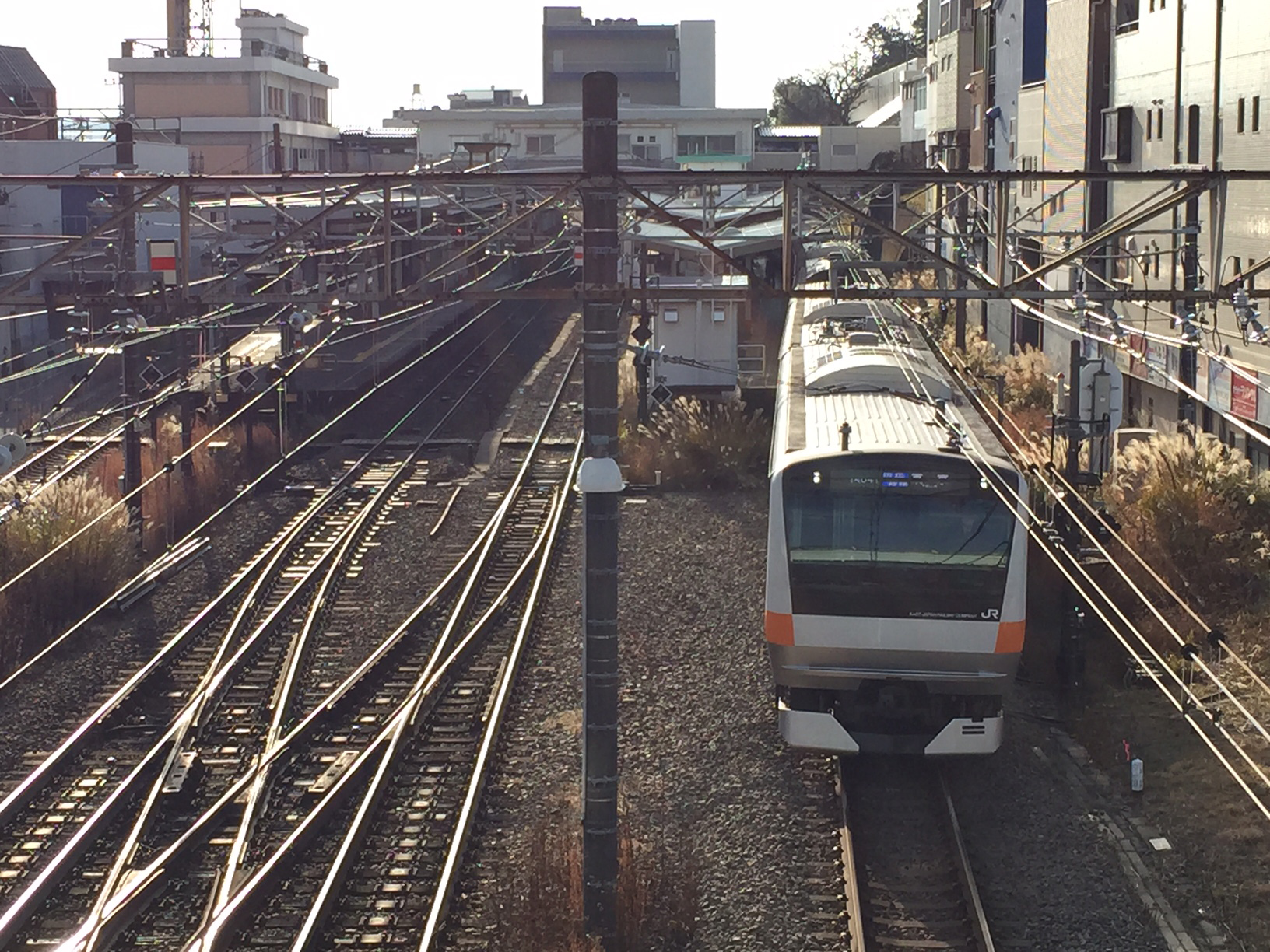 横位置で線路を入れた写真。線路沿いだけでなく、線路に架かった歩道橋の上から撮るのもありです。
