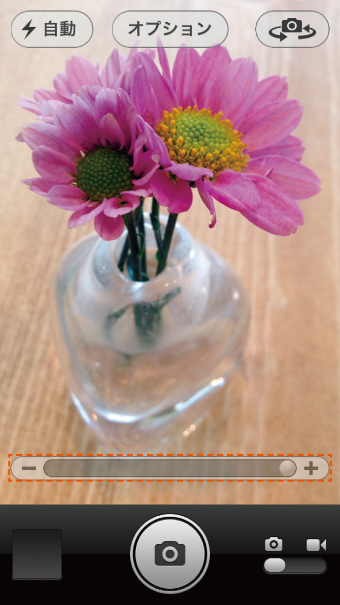 カメラを起動したら被写体に向け画面をピンチアウトします。すると、画面下部にズームのスライドバーが表示されます。拡大率は、ピンチでも、スライドバーでも調整可能です。好みの拡大率のところで指を離し、シャッターボタンをタップしてください。前面(イン)カメラでは、ズーム機能は働きません。