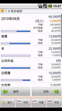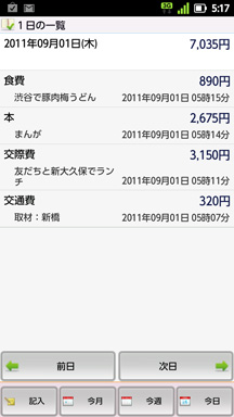 支出を入力すれば、その合計を日・週・月ごとに一覧で確認することが可能。支出は予算同様、8つにカテゴライズできるだけでなく、メモ欄を利用すれば、どういった用途でお金を使用したのかを詳細に書き留めておくことができます。忙しいときなどは金額を記入しておいて、後で再編集してもOK。入力した日時が保存されているので、だいたい何を買ったのか、すぐに思い出せるはずです。アプリを開くと常に、記入画面と、今月・今週・今日の収支合計切り替えボタンが表示されてので、面倒な操作ナシにボタンクリック一発で記入・確認ができます!