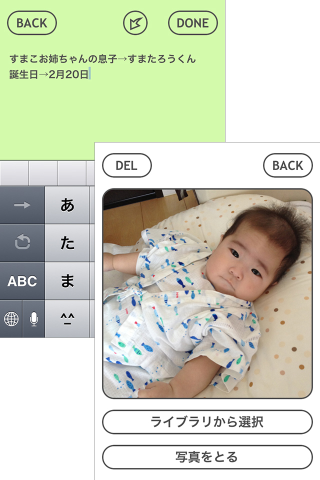アプリを起動すると、4色に分けられた画面が表示されます。メモの内容を4つのカテゴリに分けて管理するというシンプルな作りです。4つのカテゴリは4色に分けられており、表示されている数字はそれぞれに保存されているメモの数です。また、初期設定では[MYSELF](青)[FAMILY](緑)[BUSINESS](橙)[TRASH](黄)となっていますが、タイトルや色は変更できます。また、一度登録したメモでも別のカテゴリへ簡単に移動できます。メモを登録したいカテゴリをタップすると、メモ一覧画面が表示されます。画面右上の[NEW]をタップして、メモの新規作成画面へ。画面切り替えの際に、3Dのキューブが回転するようなアニメーションで表現されるのも、センスの良さを感じますね。新規作成画面では、メモを入力しましょう。メモに入力した1行目はタイトルとなり、一覧画面に表示されます。メモし終わったら右上の[DONE]をタップして保存。[DONE]をタップすると、画面上部に[アラームボタン][カメラボタン]が現れます。[カメラボタン]をタップして、[ライブラリから選択]または[写真をとる]を選ぶと、メモと一緒に写真を保存することができます。