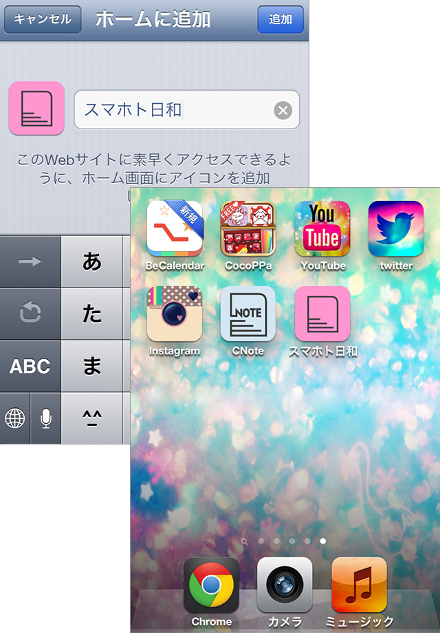 メモを保存した後の画面左から二番目の[アラームボタン]をタップすると、メモにアラームを設定することができます。アラームを鳴らしたい日をカレンダーで選んだら、時間をスライダーで設定します。画面上部に表示される設定日時を確認したら、左上の[ON]をタップで設定完了です。アラームを設定すればうっかり用事を忘れちゃった、ということも無くなりそうですね。うっかり防止機能はもうひとつ。メモへのショートカットをホーム画面に設置できるんです。目的のメモを開いて、画面上部右から2番目、矢印の[ショートカットボタン]をタップします。Safari が起動し、[下側の矢印ボタンを押して「ホーム画面に追加」を選択してください]というメッセージが表示されます。表示に従って、画面下部の矢印ボタン(アクションボタン)を押し、[ホーム画面に追加]をタップしましょう。[ホームに追加]の画面が表示されます。メモのタイトルをそのまま使うか、ショートカット名を変更したら、画面右上の[追加]をタップ。ホーム画面に、メモへのショートカットが追加されます。ホーム画面に表示されたメモアイコンをタップすると、素早くメモを確認することができます。よく使うメモはホーム画面に並べておくととても便利ですね。スマートフォンでメモをとることが多い方には、ぜひ使っていただきたいアプリです!