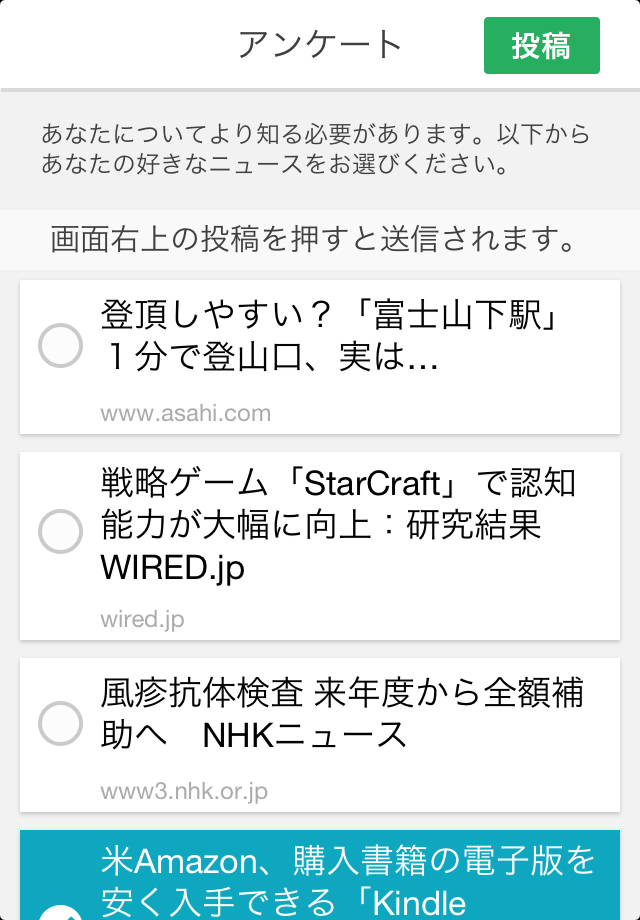 今回はiPhone版で解説しますね。アプリを起動すると、 [Facebookで登録・ログイン][Twitterで登録・ログイン][メールで登録・ログイン]という、登録・ログインアカウント選択画面が表示されます。FacebookやTwitterを利用している方は、そのアカウントで登録・ログインしておくと、ソーシャルメディアからも興味がありそうな記事の解析が行われるので、メールアドレス登録よりもオススメです。アカウントを登録すると、[アンケート]が表示されます。表示されている記事一覧の中から、興味のあるもの、好みのものを5つ選んでタップしましょう。選び終わったら画面右上の緑色の[投稿]ボタンをタップすると、解析がスタート。解析が終わるまでしばらく待ちましょう。アプリを終了させても大丈夫です。