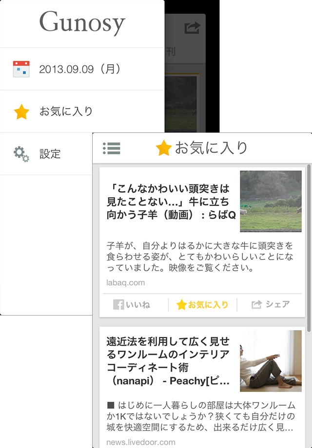 しばらくすると、解析が終了し、[朝刊]タブに、配信された記事の一覧が表示されます。気になる記事をタップして記事の内容がチェックしましょう。記事画面の右上のアクションボタンをタップすると、[シェアする][safariで開く][メールで送る][URLをコピー]というメニューが表示されます。[シェアする]では、Facebook・Twitterで記事を共有できます。面白い記事があったら、ぜひお友達にもおすすめしてくださいね。画面上部にある日付をタップすると、カレンダーが表示され、日付を選ぶことで、過去に配信された記事を読むことができます。また、時間のあるときに読みたい記事や、また読みたい記事があったら、記事一覧の[お気に入り]ボタンをタップして[お気に入り]に追加しておきましょう。画面左上のメニューボタンをタップすると、画面の左側にメニューが表示されます。[お気に入り]メニューでは、登録したお気に入りの記事一覧を見ることができます。[設定]メニューでは、記事の配信時間や通知設定、アカウント設定などができます。記事は一日2回、朝夕に受け取ることができます。朝刊は5時~11時、夕刊は17時~23時の設定が可能で、配信通知や夕刊はOFFにすることもできます。 「Gunosy(グノシー)」は、新聞社やポータルなどのニュースや、技術系・生活系の情報サイト、ブログやまとめサイトなど、たくさんの記事の中から、興味にあった最新のニュースを届けてくれます。使えば使うほど、好みに合ったニュースが届くようになるので、気になった方は、いますぐ使ってみてくださいね!