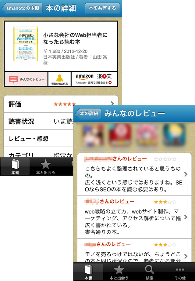 画面下部のメニューから[本棚]ボタンをタップすると、これまでに登録したアイテムの一覧が表示されます。まるで本物の本棚のようですね!画面左上の[本棚内検索]や画面右上の[絞り込み]で、タイトルなどのフリーワード・読書状況・カテゴリ・ジャンルでアイテムを検索することができます。先ほど登録した本をタップしてみましょう。本の詳細画面が表示され、[みんなのレビュー]を読んだり、著者の他の作品を検索したり、Amazonや楽天で商品の詳細を見ることができます。また、読書の記録として、[評価][読書状況][レビュー・感想][カテゴリ][読書メモ]をそれぞれ登録できます。 [レビュー・感想]で入力した内容は、[みんなのレビュー]として公開されます。こうして50万人以上のブクログユーザーによってレビューが書かれていくので、いろんな本のレビューをチェックして、好みのアイテムに出会うことができるんです。画面下部のメニューから[本と出会う]をタップしてみましょう。[ランキング][新刊情報]が表示されます。[ランキング]では、ブクログで登録された人気作品ランキングをチェックすることができます。気になるアイテムがあれば、[みんなのレビュー]をチェックしてみましょう。読んでみたい本があったら、[本棚に登録]をタップして[読みたい]ステータスでどんどん登録していくのも良いですね。本だけでなく、マンガや、映画(DVDなど)・音楽(CDなど)・ゲームも同様に登録することができます。全て同じ本棚に登録されますが、検索やジャンルごとに絞り込み表示ができるので、探すのもかんたんです。「ブクログ」を使って読書の秋・芸術の秋を楽しみましょう♪