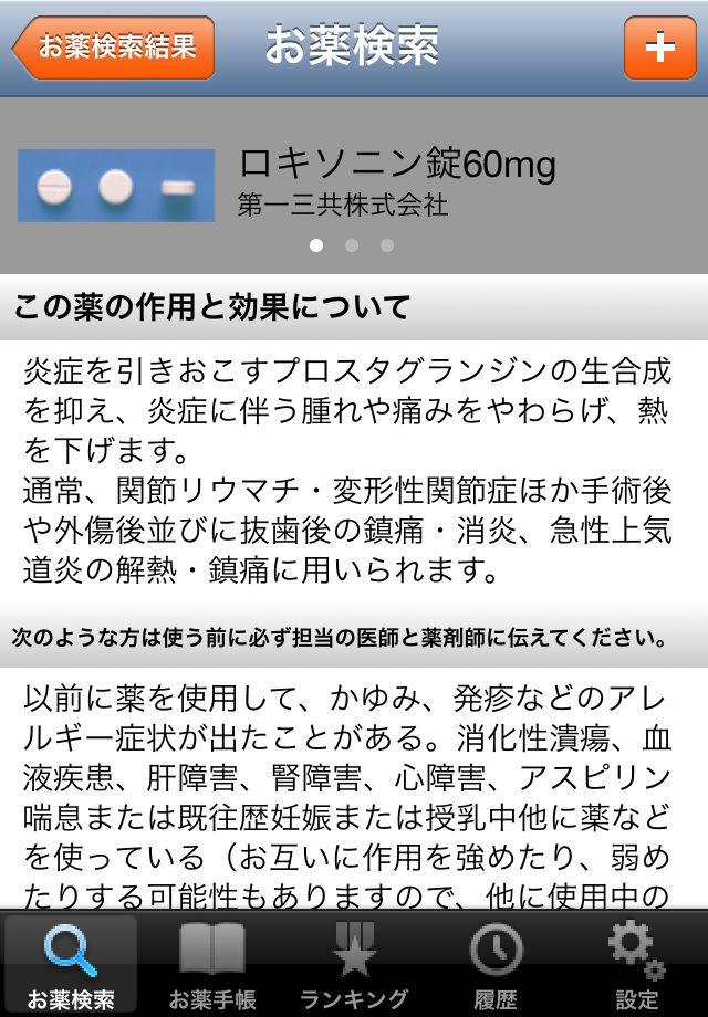 [お薬検索結果]の画面で、[ロキソニン錠60mg]をタップしました。発熱や頭痛、抜歯後などによく処方されるお薬ですね。[ロキソニン錠60mg]について、薬剤の写真と『この薬の作用と効果について』『用法・容量(この薬の使い方)』『副作用』『保管方法その他』が表示されました。処方薬の約90%、市販薬の約70%には製薬会社から提供された最新写真が掲載されています。写真に加えて、詳しい説明も書かれているので、薬剤師さんに聞きそびれたことを確認することができました!画面を左にスワイプすると、大きめの写真と『薬価』『剤形』『医薬品分類』『シート記載』『製薬会社』『主成分』の画面が表示され、より詳しい情報を見ることができました。さらにもう一度左にスワイプすると、Twitter投稿画面が表示されました。このお薬に関する感想や質問などをTwitterに投稿する事ができます。画面右上の[+]ボタンをタップすると、お薬手帳にこのお薬の情報を追加することができます。[お薬手帳1]~[お薬手帳4]の4つのお薬手帳があり、手帳名(ラベル)も設定画面から変更できるので、家族ごとや疾患ごとにお薬を分類して登録すれば、マイお薬手帳が作れます。また、お薬ごとにメモを残せるので、どんな病気で処方されたのかなどを書き留めておくと良いですね。お薬と上手に付き合って、健康を維持しましょう!