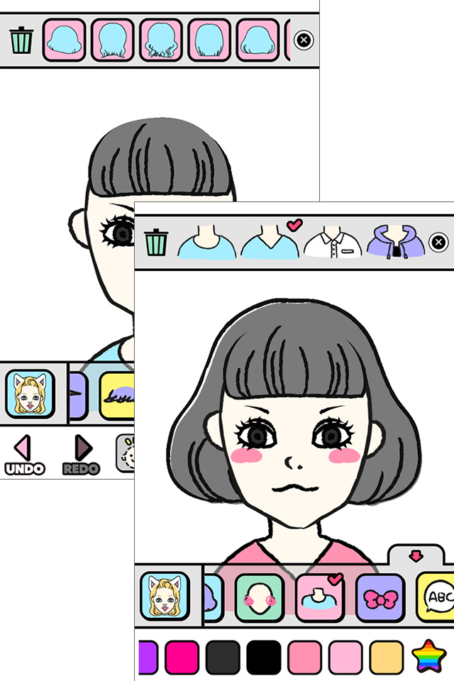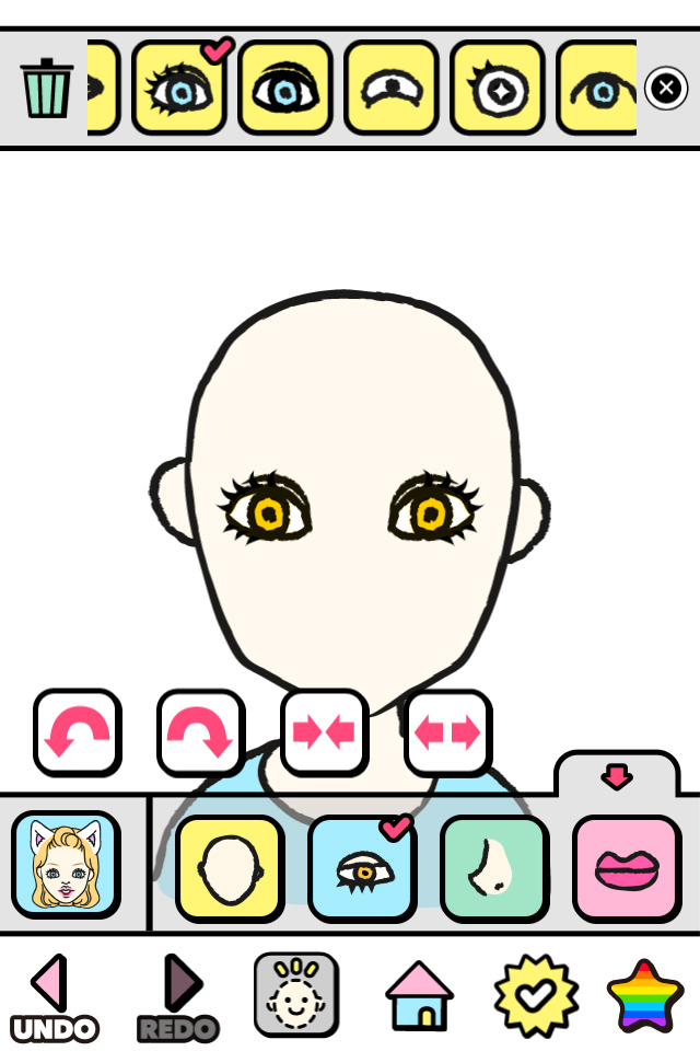 今回はiPhone版で解説しますね。アプリを起動すると、[HOW TO][MAKE][TIMELINE][LIST]というメニューが表示されるので、[HOW TO]で使い方をチェックしたら、[MAKE]をタップして似顔絵作成スタート!まずは画面の下から二段目、帯状に表示されている部分の一番左の猫耳金髪女性のアイコンをタップしてみましょう。アニメ風のアイコンに変わり、パーツもアニメ風のテイストに変わりました。このアイコンをタップすることで、似顔絵のテイストを選択できます。かわいい系からギャグ系まで、さまざまなテイストの似顔絵を作ることができるんです。テイストを選んだら、輪郭・目・鼻・口・まゆげ・服・表情アイテム・装飾アイテム・背景など各パーツを選んで配置していきましょう。例えば[目]を配置するときは、[目]のメニューをタップして、画面上部に表示されるたくさんの[目]のパーツから好きなものをタップ。選択したパーツは自由に編集できるので、回転、間隔・角度調整、移動や、ピンチイン・ピンチアウトで拡大縮小など、コレ!と思う配置にしてくださいね。また、画面下部右端の★マークをタップすると、色も自由に選べます。やり直したいときは、画面下部左のUNDO・REDOをタップしてくださいね。