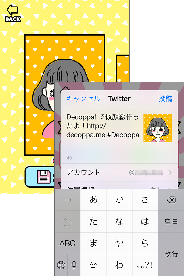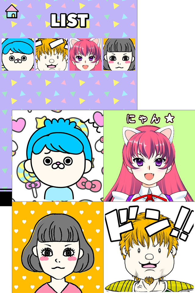 似顔絵ができたら、画面下部のチェックマークをタップ。保存メニューが表示され、保存するサイズやパターンを選ぶことができます。SNSのアイコンやスマートフォンの壁紙にできるサイズも選べるのが便利ですね。Twitter、Facebook、LINE、メールでシェアするのも簡単です。似顔絵をシェアすると、使えるパーツが1個増えます!たくさんシェアしてレアパーツをゲットしましょう!自分だけでなく、家族や友達の似顔絵を作ってプレゼントするのもいいですね。作った似顔絵は、[LIST]メニューから確認することができます。また、[TIMELINE]に投稿することもできます。[TIMELINE]には世界中の「Decoppa!」ユーザーから投稿された似顔絵が並びます。自分の似顔絵にLikeやコメントが付くかも!他のユーザーの似顔絵を参考に、ステキな似顔絵をどんどん作ってくださいね。テイストの選択を変えてみると、同じアプリで作ったとは思えない違った印象の似顔絵が出来上がりますよ!いろんな似顔絵を作ってみてくださいね♪