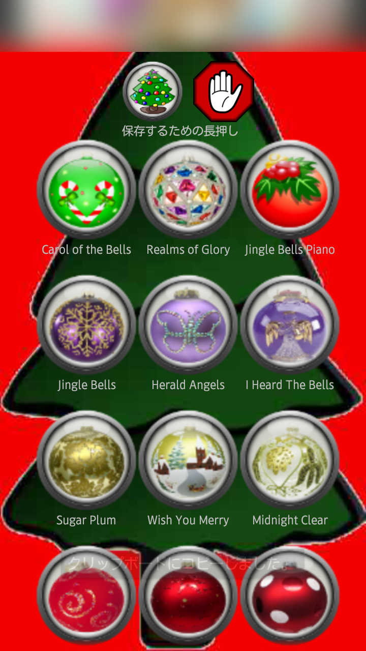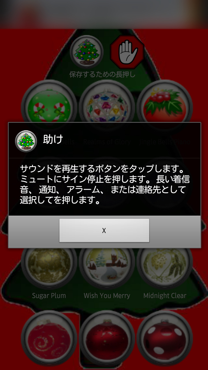 テレビやラジオから流れてくるクリスマス・ソングを耳にすると、なんだかウキウキしますね。スマートフォンの着信音や通知音、アラーム音もクリスマスのメロディにして、もっと浮かれちゃいましょう!「クリスマス着メロ」をインストールして、アプリを起動しましょう。クリスマスツリーに飾られたオーナメントのように丸いアイコンがたくさん並んだ画面が表示されます。この丸いアイコンをタップすると、収録されているメロディを聴くことができます。 [calol of the Bells]と書かれた一番左上のアイコンをタップしてみると、映画『ホーム・アローン』やCMソングでおなじみのクロスマスキャロルでした。曲名が英語なのでなかなかピンとこない曲もありますが、タップして聴いてみると、「あ!聴いたことある!」と思い当たる曲が多いので、まずはどんどん試聴してみましょう!端末のメニューボタンを押して、[Instructions]をタップすると、ヘルプ画面が表示されます。日本語が少し怪しいですが、曲のアイコンをタップして試聴、もう一度タップするとストップ、長押しすると着信音などに設定できる、という機能の説明が表示されます。