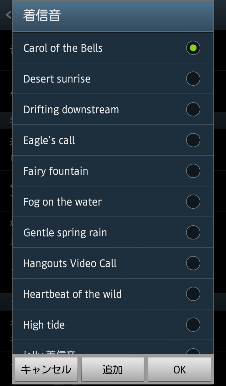 一通り試聴してみると、有名なクリスマス・ソングからサンタクロースの笑い声まで、クリスマスにちなんだ曲や効果音がたくさん用意されていました。気に入ったメロディに出会えたら、丸いアイコンを長押ししてください。設定メニューが表示され、[着メロ][通知][アラーム][人(電話帳に登録されている番号に個別で着信音を設定)]を選んでタップするだけで、設定完了です。先ほど試聴した、画面左上の[calol of the Bells]を着信音に設定してみましょう。[calol of the Bells]と書かれた丸いアイコンを長押しして、設定メニューを表示させたら、[着メロ]をタップ。設定完了の表示が出たので、着信音の設定を確認してみると、[calol of the Bells]がバッチリ設定されています。これで、電話がかかってくるとクリスマス気分を楽しめるようになりました。アラーム音に設定して、クリスマスまでの間、クリスマス・ソングで目覚めるのも楽しそうです。ぜひ使ってみてくださいね!