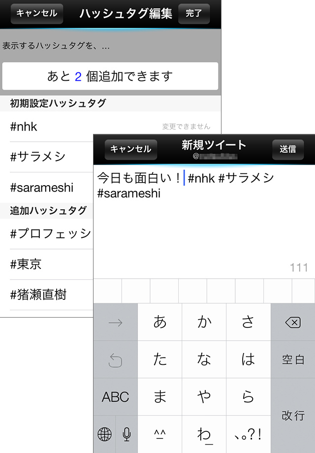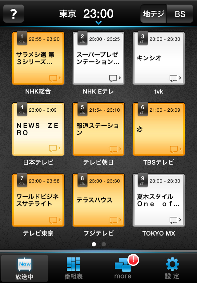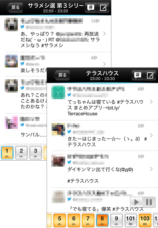 今回はiPhone版で解説しますね。アプリを起動すると、現在放送中の番組一覧が正方形のボタンで表示されます。現在地と表示されている地域が異なる場合は、画面下部右側の[設定]ボタンから、正しい地域を設定しましょう。全国の地デジ・BSに対応しています。画面右上の[地デジ][BS]ボタンで、地上デジタル放送とBSを切り替えることもできます。[放送中]画面の正方形のボタンには、設定した地域で視聴可能なチャンネル名・放送時間・番組名が表示されます。ボタンの色が、白・薄いオレンジ・濃いオレンジに分かれていることにお気づきですか?番組名のボタンは、Twitterでの『盛り上がり度』に応じて色分け表示される仕組みになっています。Twitterのつぶやきが少ない番組ボタンは白、つぶやきが多い番組ボタンは濃いオレンジと、一目でどの番組が盛り上がっているかが分かるようになっています。番組ボタンをタップすると、その番組について語られているTwitterのつぶやきがタイムラインで表示されます。つぶやきは、テレビ局のハッシュタグ※+番組のハッシュタグの合わせ技で自動収集されていて、つぶやきが多くなると、タイムラインが高速スクロール!リアルタイムで盛り上がりを感じることができます。これらの機能は、Twitterのアカウントを持っていなくても利用できます。