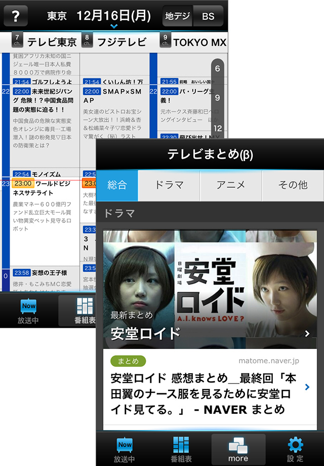 番組タイムラインには、テレビ局と番組のハッシュタグを自動収集したつぶやきが表示されますが、つぶやきを収集するハッシュタグをカスタマイズすることもできます。画面右上の#ボタンをタップすると、[ハッシュタグ編集]画面が表示され、[初期設定ハッシュタグ]を非表示にしたり、[追加ハッシュタグ]で好きなハッシュタグを追加するなど、タイムラインを自分好みにカスタマイズすることもできます。また、Twitterのアカウントを持っていれば、番組のタイムラインの画面右上の投稿ボタンをタップして、その番組に対するつぶやきを簡単に投稿することができます。番組に関するハッシュタグを自動的につけてくれるので、いちいちハッシュタグを探したり入力したりすることなく、いま盛り上がっているTwitterテレビ番組実況に、いち早く参加することができますメイン画面の下部のメニュー[番組表]をタップすると、番組表が表示されます。1週間先のテレビ番組表まで確認できるので、気になる今後の番組もばっちりチェックできます。下部のメニュー[more]をタップすると、[テレビまとめ(β)]が表示されます。[テレビまとめ(β)]は、テレビ番組に関するまとめのまとめページ。最近話題になったテレビ番組関連ネタ、トピックが紹介されています。テレビを観る機会が増える年末年始、「みるぞう」を使って一緒に盛り上がりましょう!