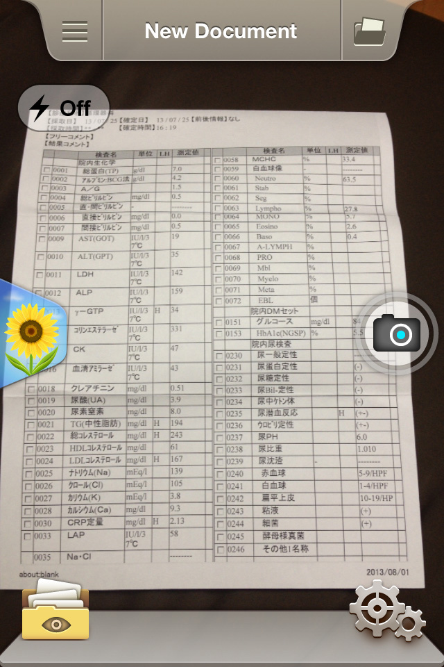 アプリを起動すると、撮影画面が起動します。画面右のカメラボタンをタップして、スキャンしたい紙のドキュメントを撮影しましょう。画面左のひまわりのボタンをタップすると、スマートフォンに保存されている画像を選択することもできます。