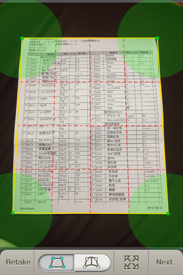 撮影後の画面では、撮影したドキュメントの周囲を囲む黄色の線と、角に緑の点が自動で表示されます。斜めに撮影してしまったり、元の紙に折り目がついていたりしても、自動で調整してくれるので大丈夫!自動調整でもかなり正確に周囲を認識してくれますが、もし線がドキュメントからずれていると感じたら、緑の円の部分をタッチしながら線や点の位置を手動で調整することもできます。