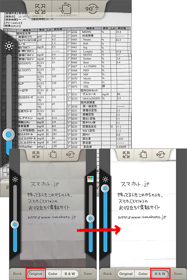 [Original]は、撮影した写真そのままの状態で取り込みます。折り目や陰影もそのままなので、ドキュメントによっては読みにくいかもしれません。[color]は色を保持しつつ、読みやすくしてくれます。[B&W]では背景が白、文字が黒のモノクロになります。元のドキュメントが黒一色の印刷物の場合、[B&A]を選択後、左右に表示されるスライダーで明るさや色味の調整を行うと、折り目や陰影を目立たないようにすることもできます。
