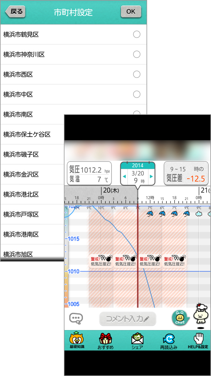 生活する地点を選択して、予報や気圧グラフをチェック!