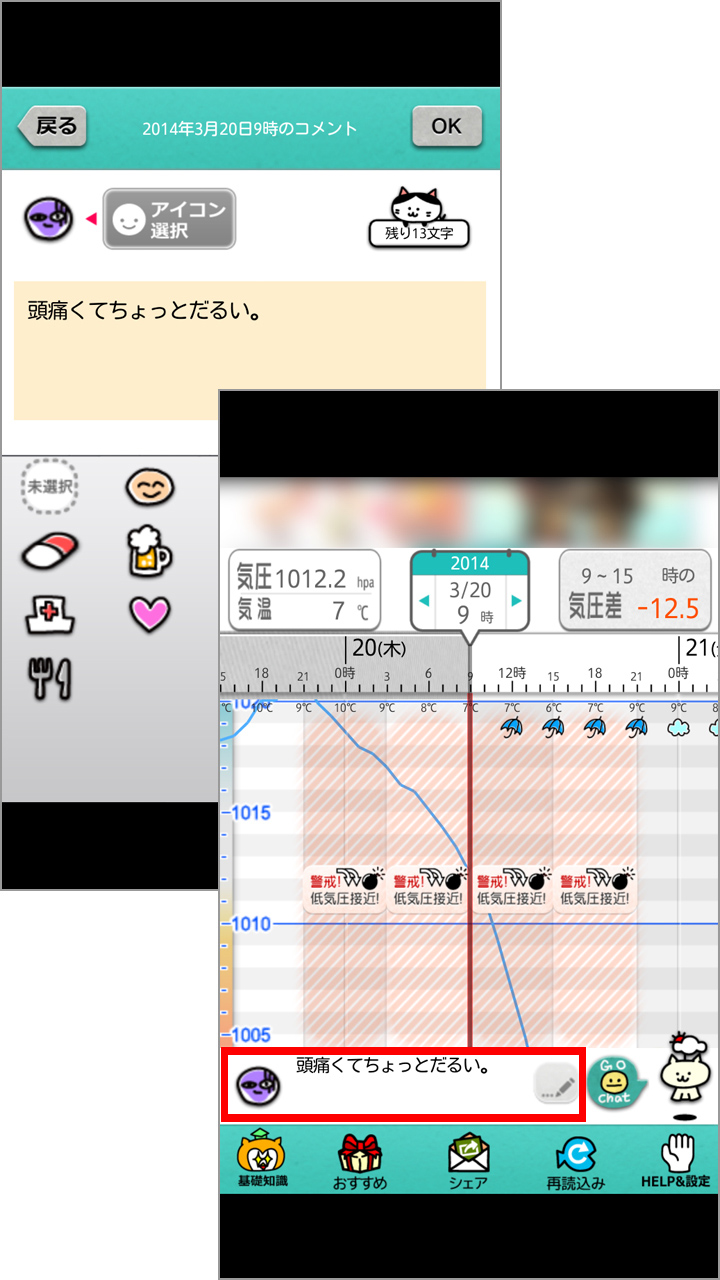 予報画面の下部に、[コメント入力]と書かれたエリアがあります。ここをタップすると、頭痛ダイアリーをつけることができます。アイコンと25文字の一言コメントを、1時間に1コメント登録することができ、30日前の日付までのコメントを確認できます。