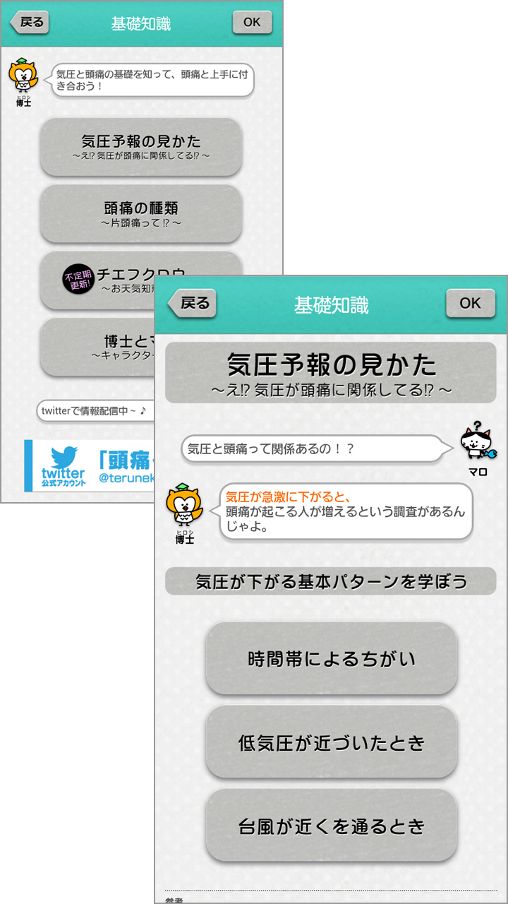「頭痛~る」には、読み物コンテンツも用意されています。画面下部のメニュー[基礎知識]をタップすると、[気圧予報の見かた~え!?気圧が頭痛に関係してる!?~][頭痛の種類~片頭痛って!?~][チエフクロウ~お天気知恵袋~(不定期更新)][博士とマロ~キャラクター紹介~]といった、気圧と頭痛とこのアプリについての基礎を知ることができます。頭痛にお悩みの方にぜひ使っていただきたいアプリです!