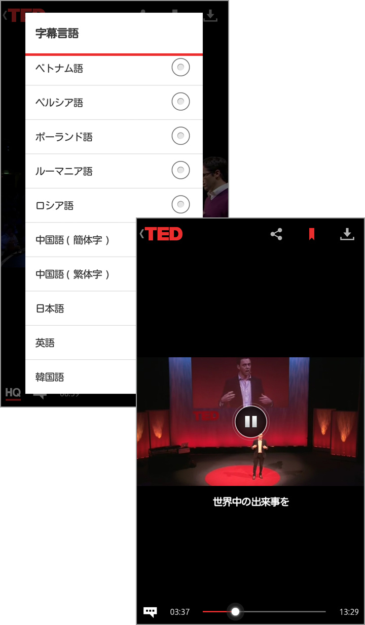 「TED」のスピーチは、主に英語で行われていますが、この「TED」アプリでは、日本語を始めとする英語以外の言語の字幕を表示することができちゃいます。