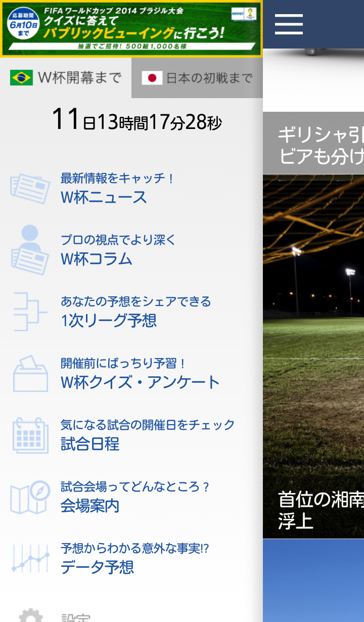 画面左上のメニューボタンをタップすると、他のコンテンツメニューが表示されます。メニューの上部には、[W杯開幕まで][日本の初戦まで]の日数が、それぞれカウントダウンで表示されています。ワクワク感が高まりますね!