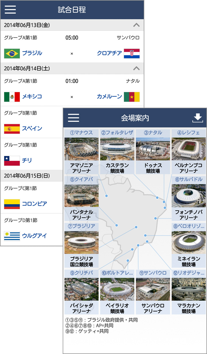 [気になる試合の開催日をチェック 試合日程]では、決勝戦までの試合日程の組み合わせや日時をチェックすることができます。[試合会場ってどんなところ? 会場案内]では、全12会場の所在地や収容人数、その会場で行われる試合日程などを見ることができます。