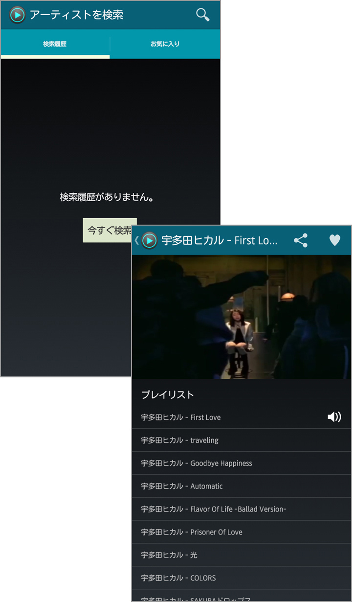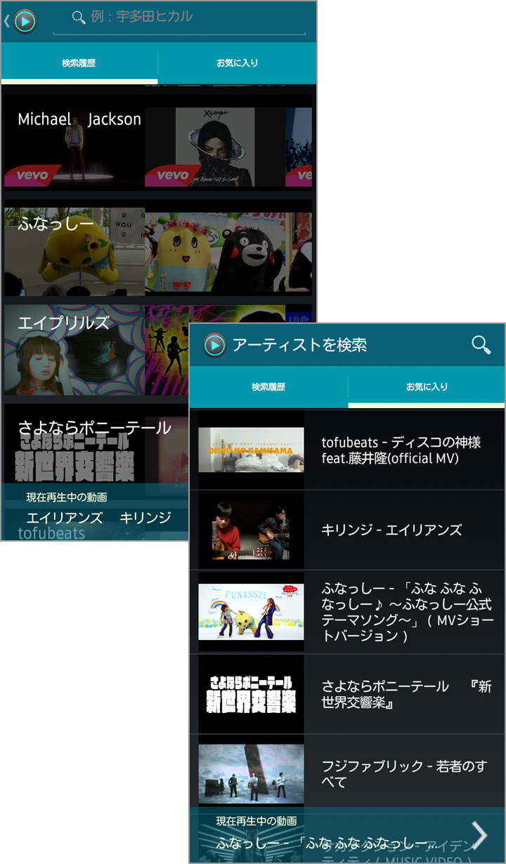メイン画面に戻ると、[検索履歴]に一度検索したアーティスト名が一覧で表示されます。アーティストごとの再生リストをもう一度再生したいときは、この検索履歴からアクセスすると便利ですよ。