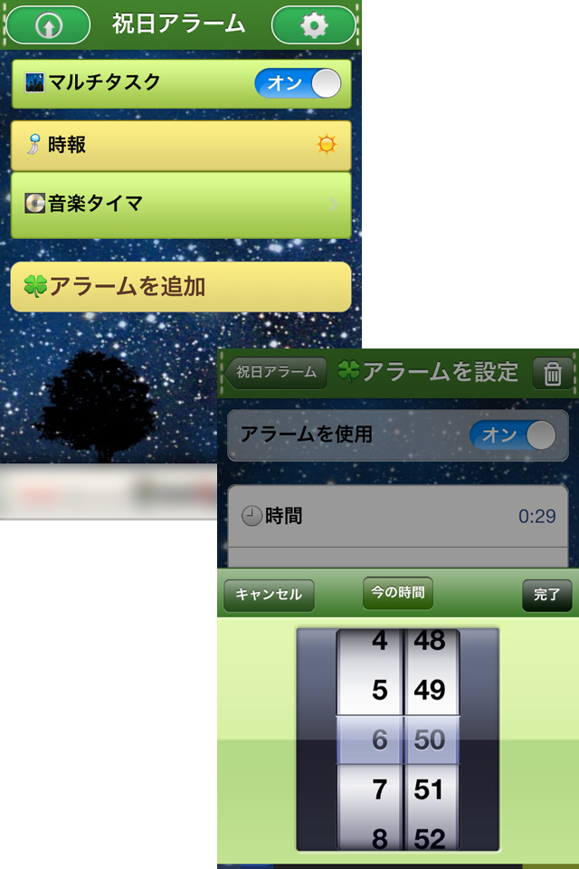 アプリを起動すると、メイン画面が表示されます。[アラームを追加]ボタンをタップして、アラームを設定しましょう。[アラームを設定]画面では、マルチタスク・時間・繰り返し・スヌーズ・マルチタスクOFF時のサウンド・マルチタスクON時のサウンド・メモ(アラーム名)・マルチタスクの停止の設定を行います。