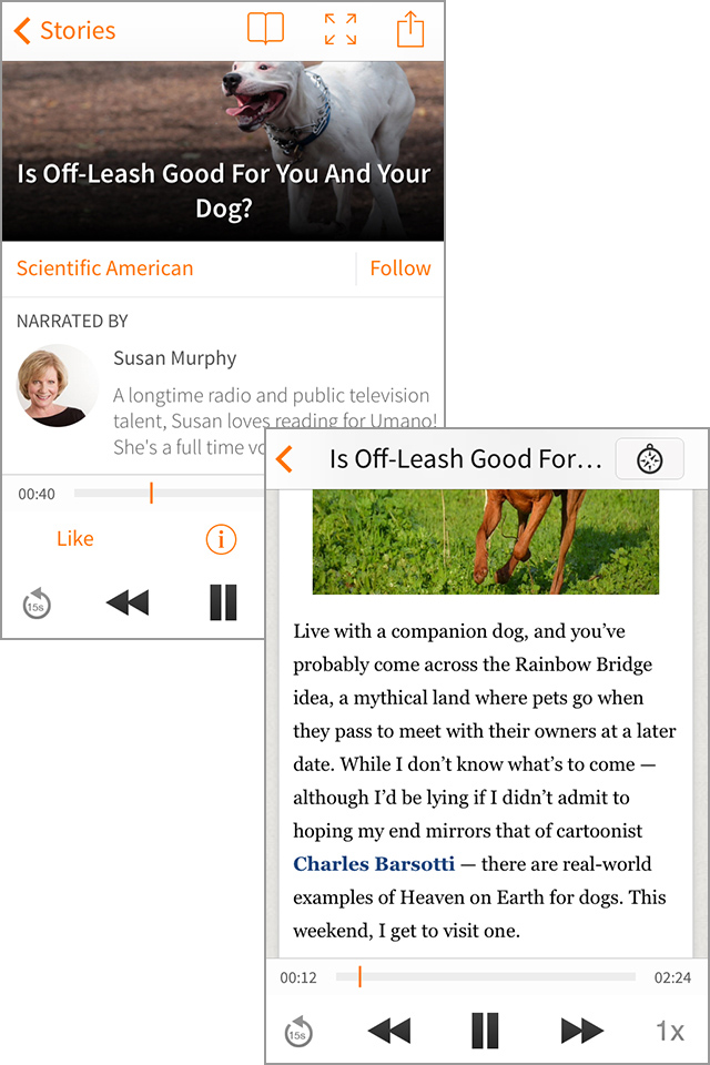 記事の読み上げ画面では、ナレーションを担当しているナレーターのプロフィールと、再生メニューが表示されます。再生ボタン[▶]をタップすると読み上げスタートです。再生中に他のアプリを開いても、バックグラウンドで再生されますので、他の作業中に聞き流すことも可能です。