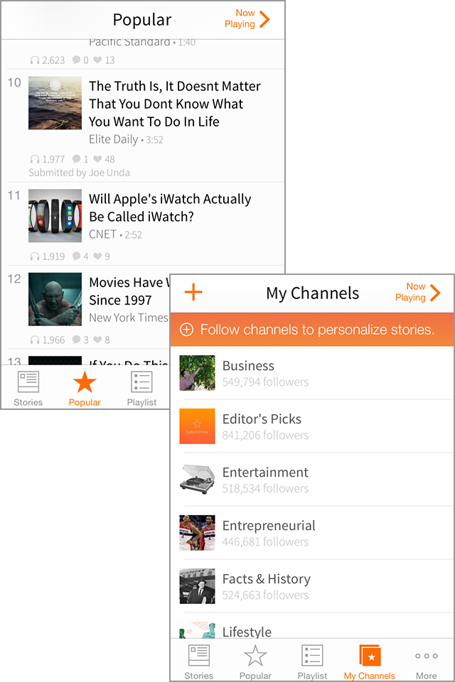 画面下部のメニュー[Popular]には、人気のある記事が表示されます。[My Channels]では、最初に選択した興味のあるジャンルごとの記事をチェックすることができます。