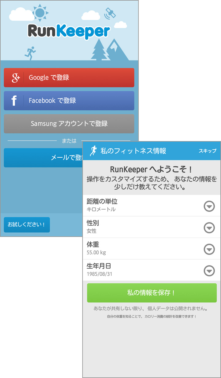 登録手続き後、[私のフィットネス情報]を入力する画面が表示されます。[距離の単位][性別][体重][生年月日]を設定しましょう。[距離の単位]は、初期設定では[マイル]になっているので、[キロメートル]に変更してください。[体重]も、初期設定では[ポンド]なので、[kg]に変更し、体重を入力しましょう。画面下部の[私の情報を保存!]ボタンをタップすると、設定完了です。