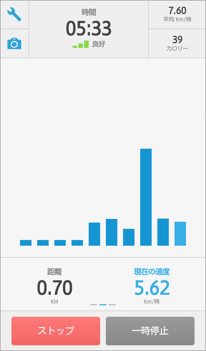 ランニングを開始すると、画面には[時間][平均速度(km/時)][消費カロリー][距離][現在の速度(km/時)]が表示され、リアルタイムで測定内容が更新されます。設定画面で音声指示をオンにしておくと、設定した時間・距離になると、音声でお知らせしてくれます。