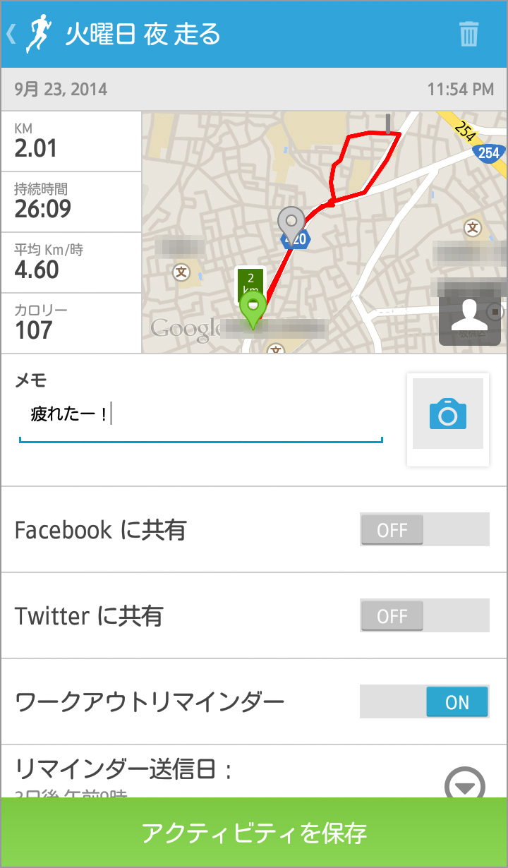 記録画面には、走った距離・持続していた時間・平均速度(km/時)・消費カロリー・走ったルートが地図に表示されます。また、コメントをメモしておけるメモ欄、写真を一緒に記録できるカメラボタンもあります。このアクティビティを共有する場合は、[Facebookに共有][Twitterに共有]をONにしましょう。[ワークアウトリマインダー]をONにすると、設定した[リマインダー送信日]にリマインダーを表示させることができます。