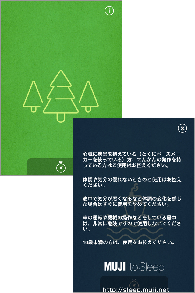 画面右上の[i]ボタンをタップすると、注意事項が表示されます。このアプリは『バイノーラルビート』という特殊な音を使用しているので、下記の方は利用をお控えください。