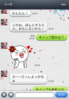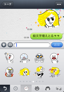 200個以上のオリジナル絵文字スタンプが搭載されており(一部ダウンロードが必要)、メッセージを楽しく彩ることができます。普通、メールやチャットで使う絵文字は文字のサイズに合わせた小さなものですが、LINEの絵文字はとにかく大きくて、インパクト大! 絵文字だけを送信し合って、友だちと遊ぶのも楽しいです。コミカルで笑える絵文字が多いので、ぜひ一度使ってみてくださいね!