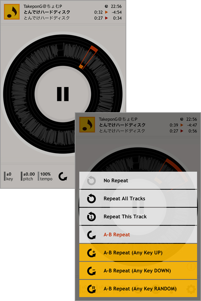 オレンジのバーを動かすと、簡単に再生位置を移動できます。赤いバーを開始位置と停止位置に設定することで、一部分だけを繰り返し再生(A-Bリピート)できます。赤いバーの位置を設定したら、画面下部の[リピートモード]ボタンをタップすると、リピートメニューが表示されます。好きな曲の特に気に入ったフレーズを繰り返し聴いて覚えたいときに便利な機能です。