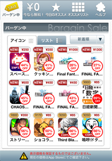 アプリを開くと、現在期間限定で値引きされているアプリのアイコンが表示されます。アイコン表示・リスト表示が可能で、新着順・割引額順・割引率順…などで表示する順番を変えることもできますよ。ただし、表示されている価格はこのアプリでは保証されていないので、気になるものがあったら、App Storeにアクセスして価格を確かめてくださいね。